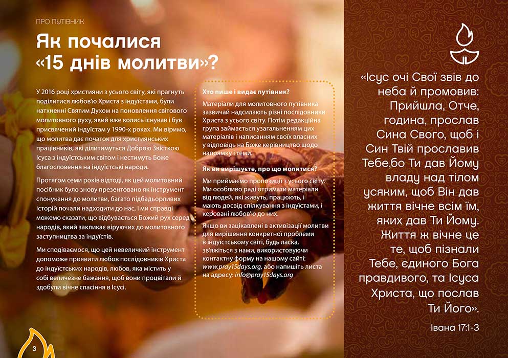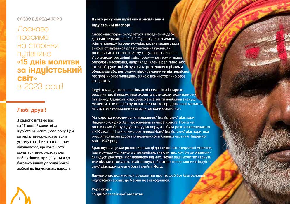 У цьому молитовному путівнику ми заохочуємо вас молитися за індуїстські громади, які належать до найбідніших у світі, вони потребують свободи, прихильності та Доброї Звістки. Моліться за благословення для них, за зцілення та можливість почути Євангеліє Ісуса Христа.